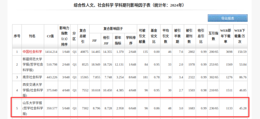 年报同时显示,《山东大学学报(哲学社会科学版)》的学术影响力再次大幅度上升。复合影响因子由2023年的6.266大幅提高到2024年的8.796,在648种综合性人文、社会科学期刊中,排名第6位;期刊综合影响因子由3.739提高到5.476,排名第4位;人文社科影响因子由3.543大幅上升为5.126,排名第3位。三项指标的数值、排名均创历史新高。