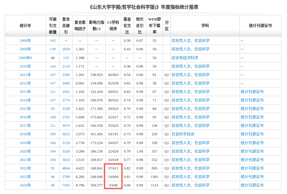 据年报数据,2024年《山东大学学报(哲学社会科学版)》的“影响力指数”(Clout Index,简称CI)由2023年的248.046大幅提升为350.577,在600多种综合性人文、社会科学期刊中的排名由第14位跃升为第5位,在综合性高校学报中排名第3位,取得了历史性突破。