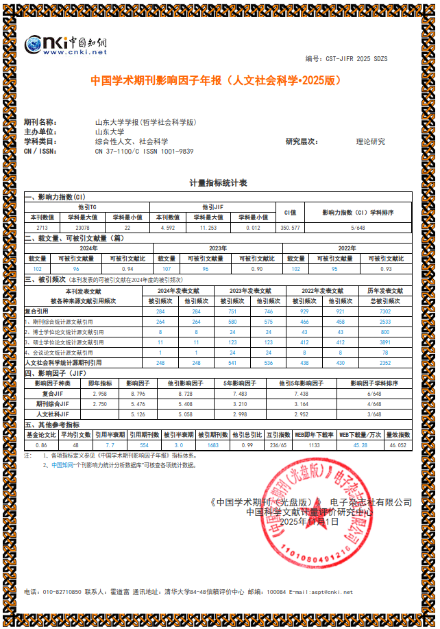 近日,《中国学术期刊(光盘版)》电子杂志社有限公司、中国科学文献计量评价研究中心联合发布了《中国学术期刊影响因子年报(人文社会科学・2025版)》,其中显示:《山东大学学报(哲学社会科学版)》的影响力指数与人文社科影响因子均进入全国前三,创历史新高。